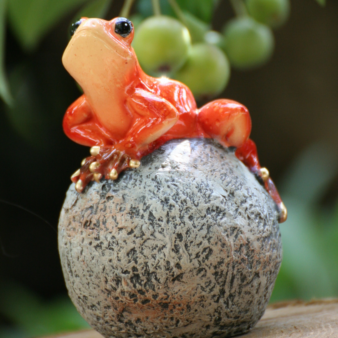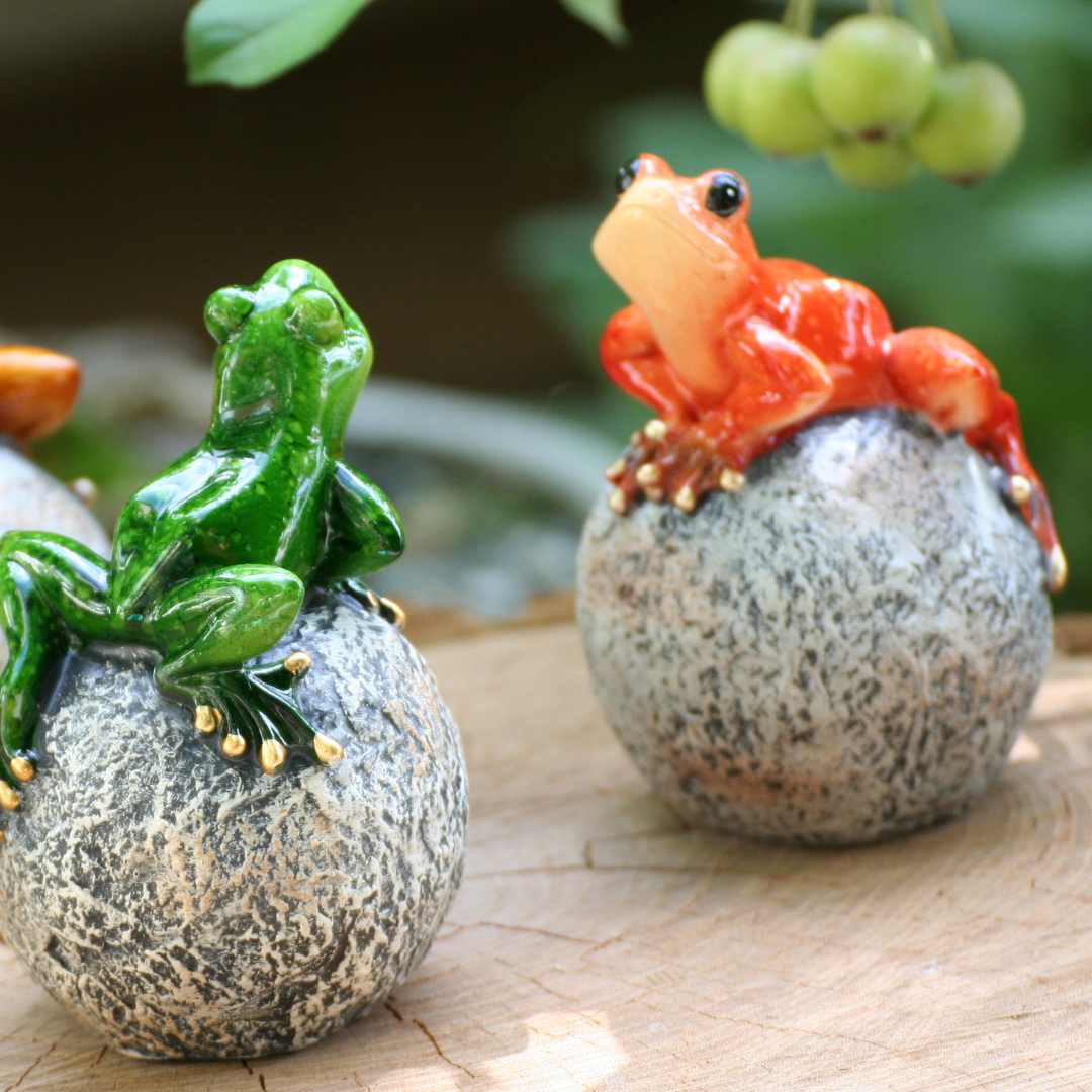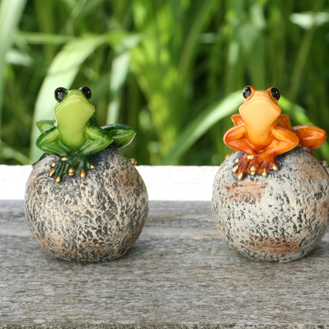 Unsere Frösche sitzen wie Könige auf ihrer Kugel. Sie sind in leuchtenden Farben und glänzendem Finish im Außenbereich sowie auch im Innenbereich zur Dekoration geeignet.